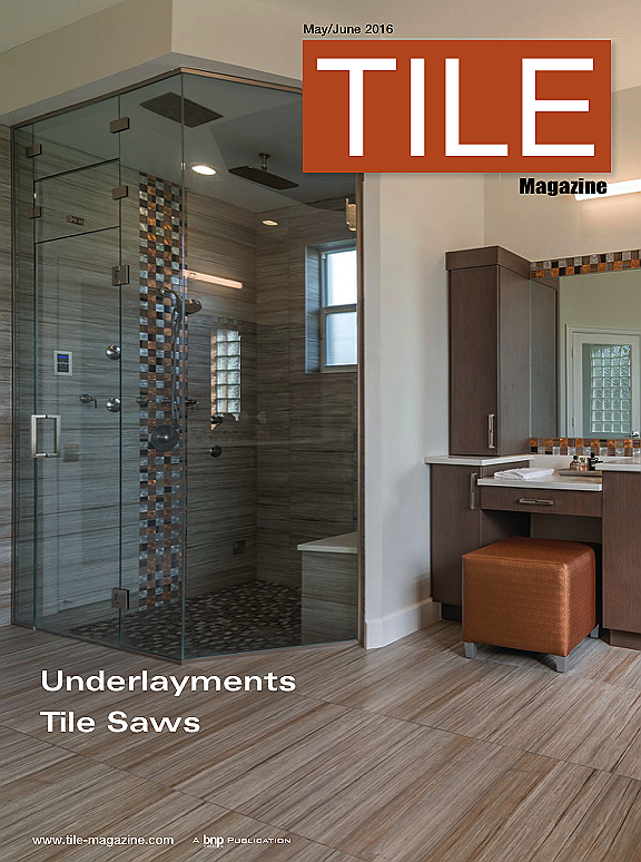 On the cover: The floor of this living space features tile from the Urban Posh by Ragno USA. Available in a 12- x 24-inch plank format, the tile integrates the look of linen with the strength and durability of robust glazed porcelain. The walls are clad in 2- x 2-inch mosaics, mesh-mounted in 12- x 12-inch modules. Learn about more new tile and installation products in the Product Showcase, which begins on page 14