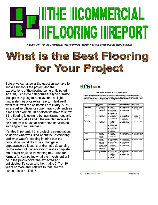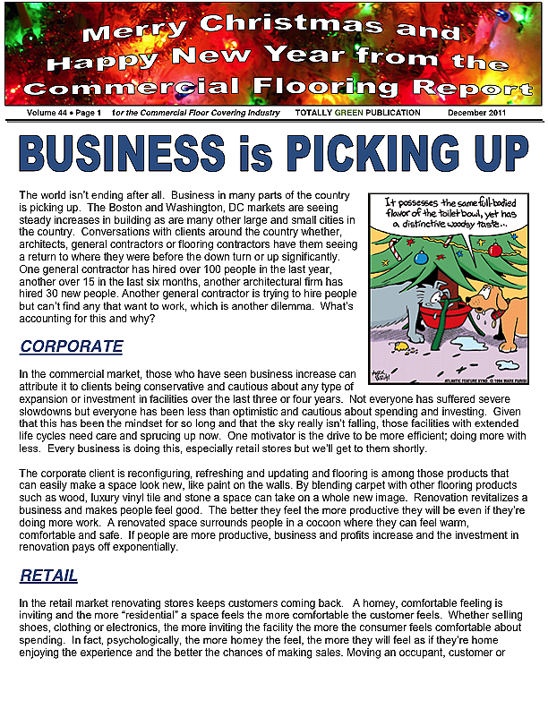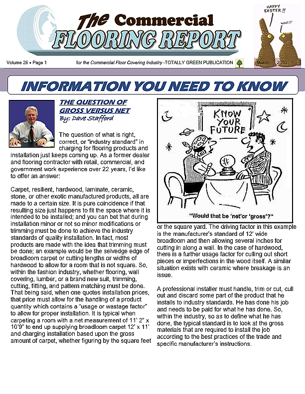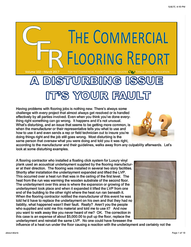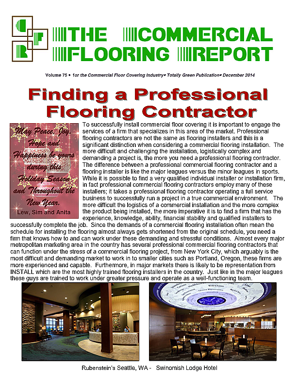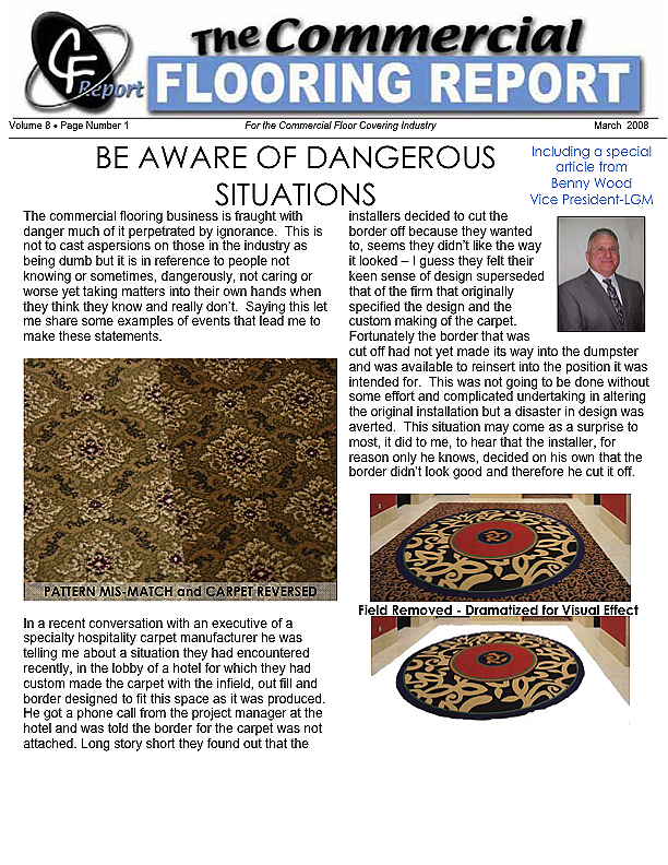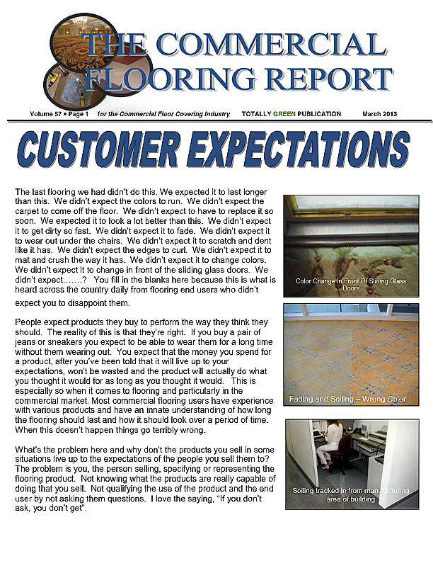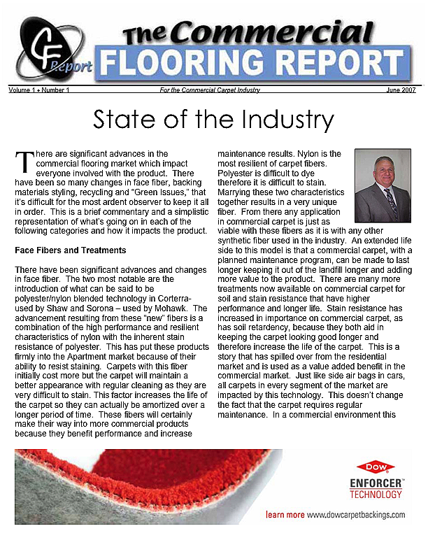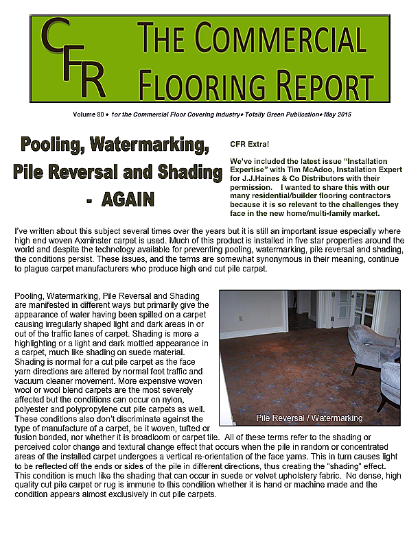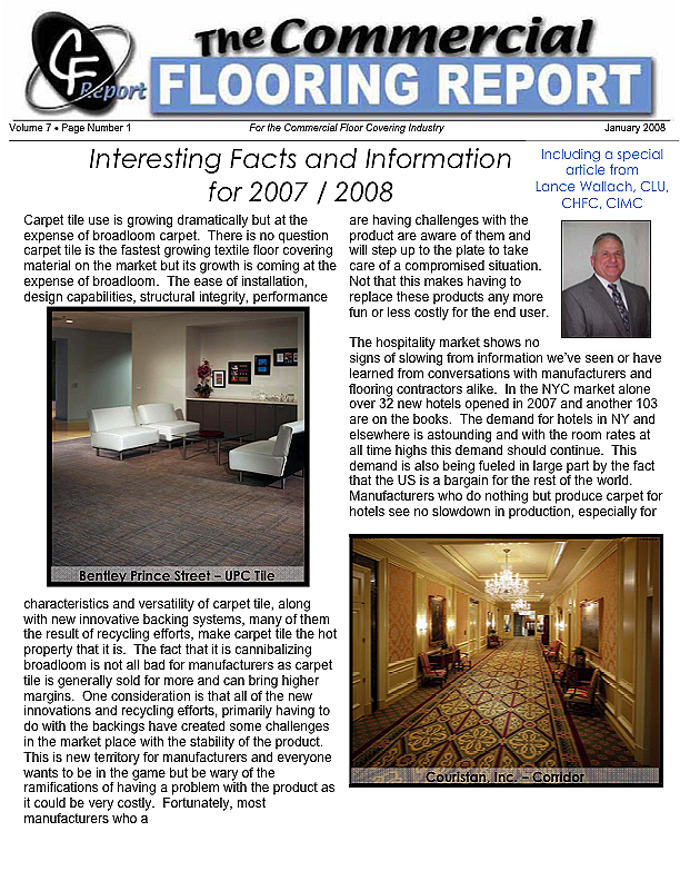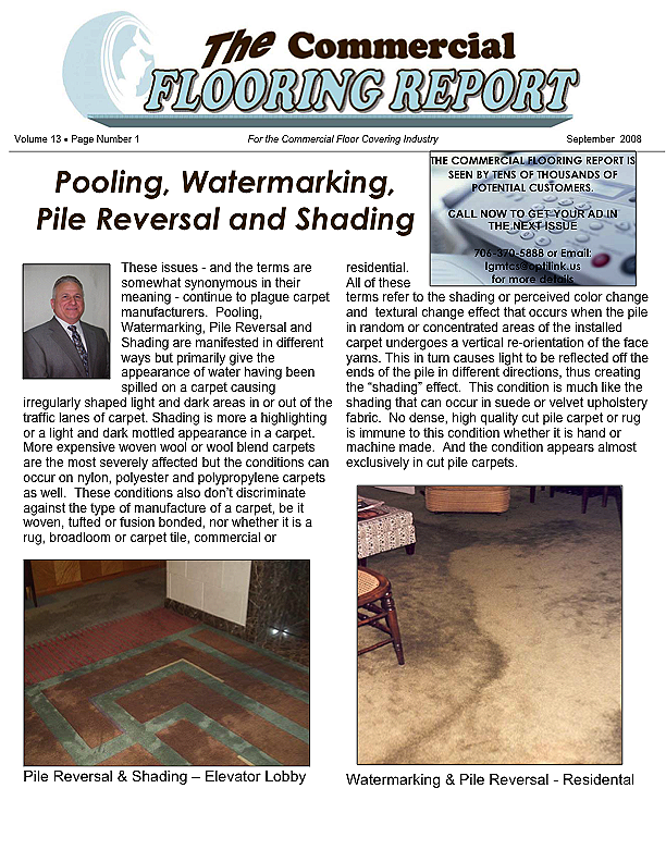 In this issue of the Commercial Flooring Report we've got several guest articles. Part II of Jeff Bishops article on commercial carpet care and cleaning, an article on correcting side match shade variation by Mike Currin and another installment from Lance Wallach on your financial well being for commercial entrepreneurs.