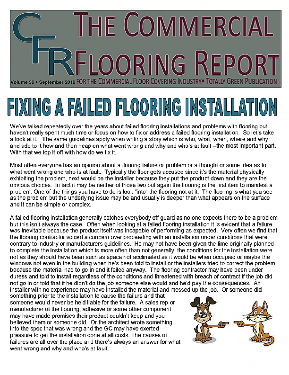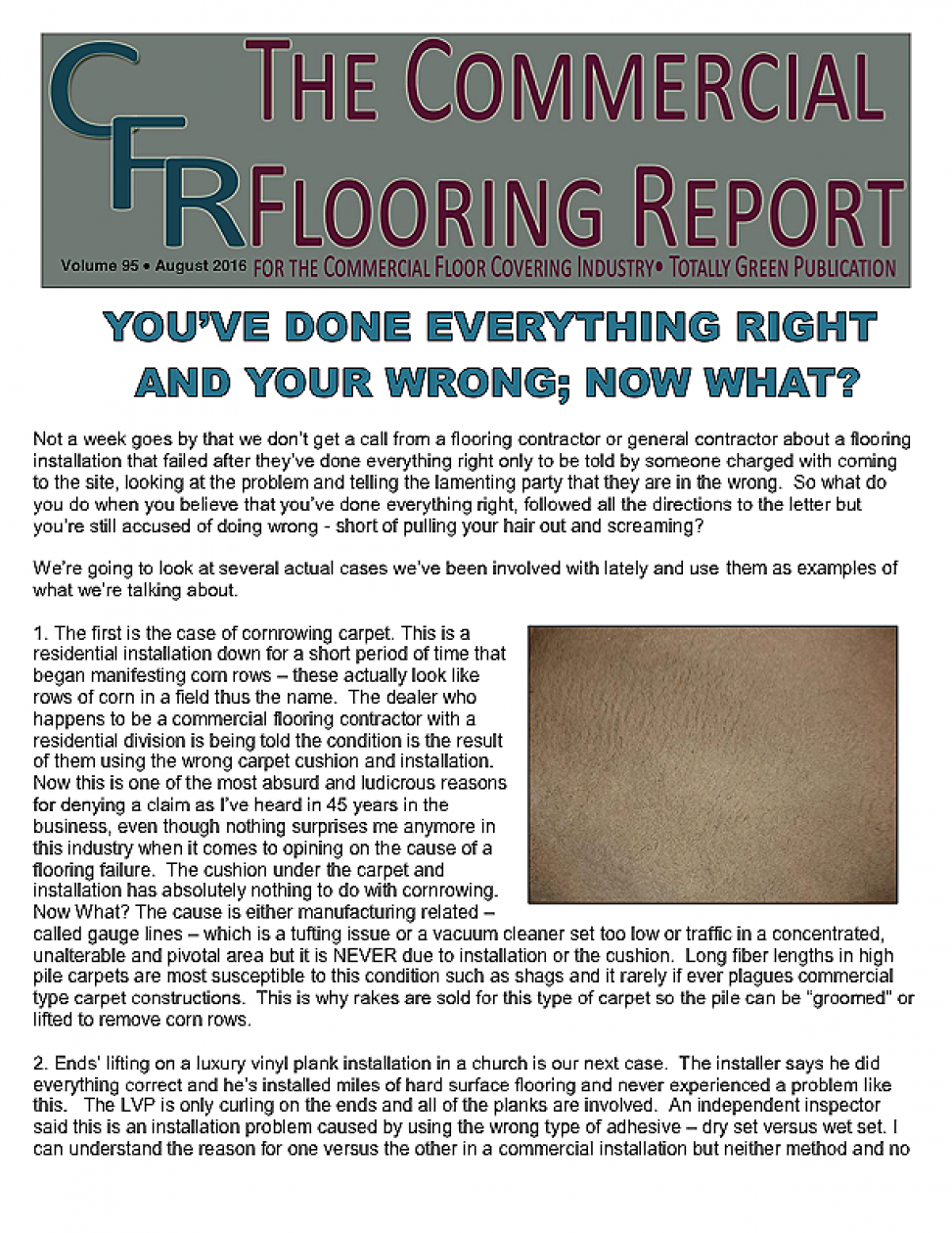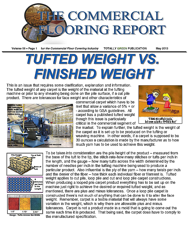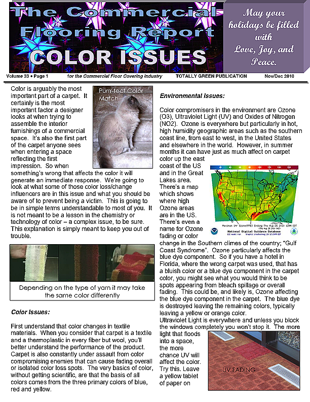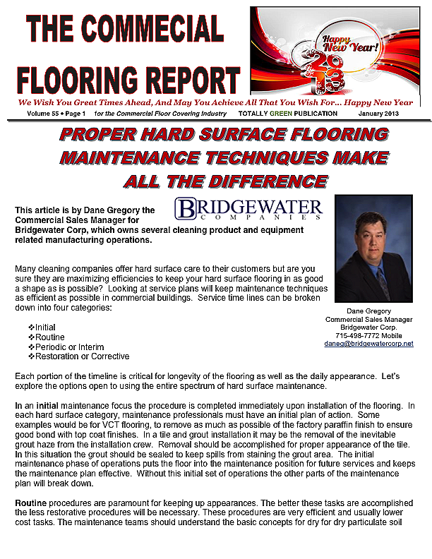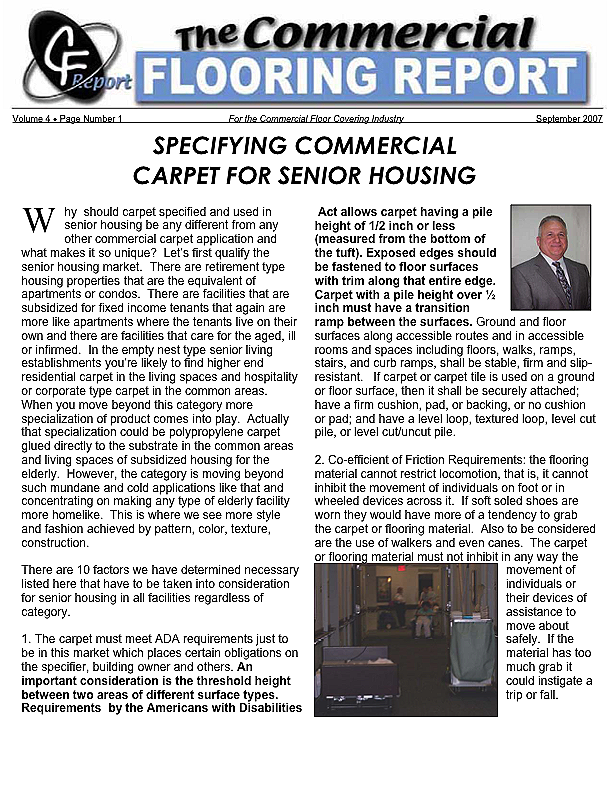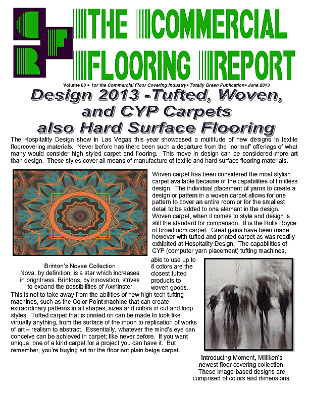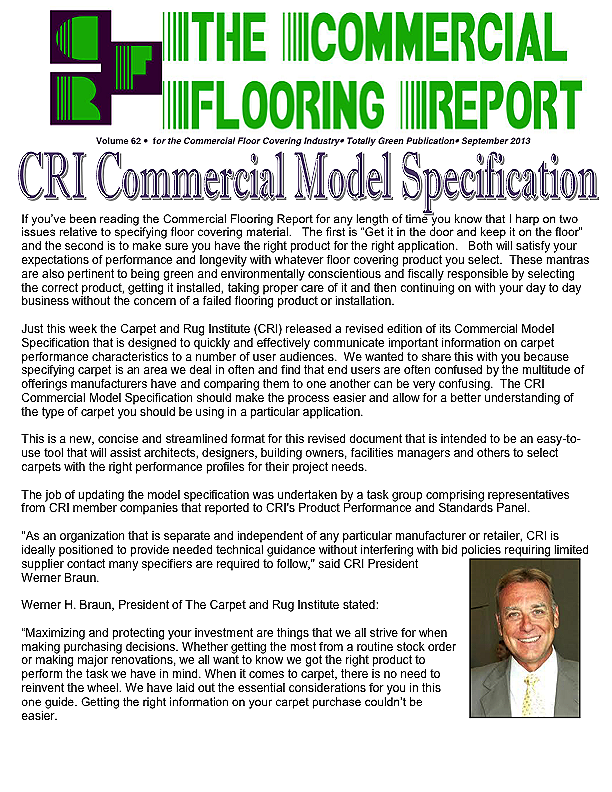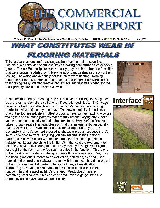 In this issue of the Commercial Flooring Report we've got several guest articles. Part II of Jeff Bishops article on commercial carpet care and cleaning, an article on correcting side match shade variation by Mike Currin and another installment from Lance Wallach on your financial well being for commercial entrepreneurs.