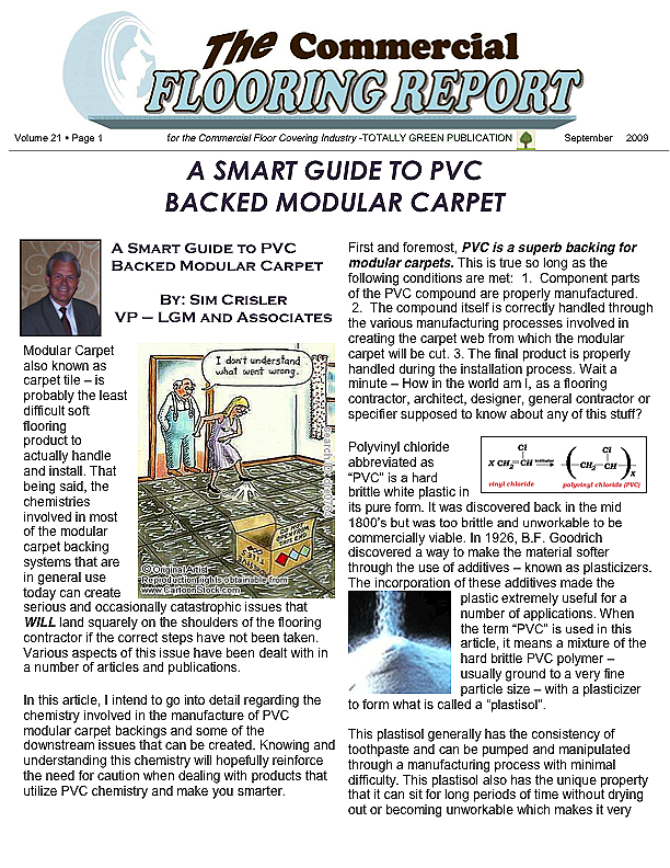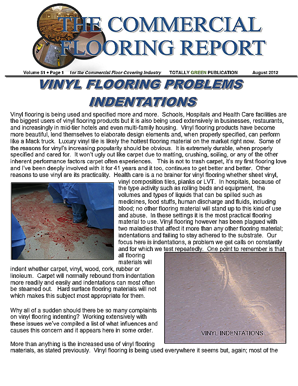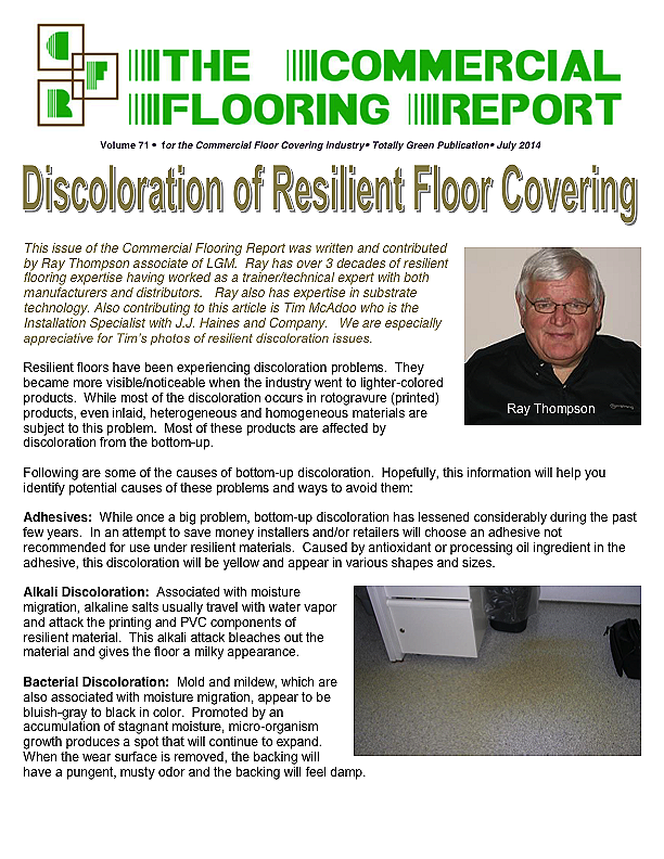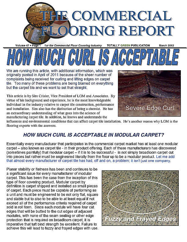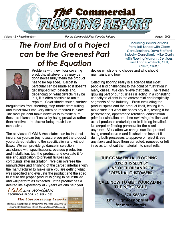The Commercial Flooring Report is a publication made available by LGM and Associates Technical Flooring Services: Floor Covering experts on Carpet, Laminate and Vinyl, Ceramic and Hardwood. Monthly newsletters designed to help you and your team understand challenges typical to the flooring industry and provide prevention and resolution.