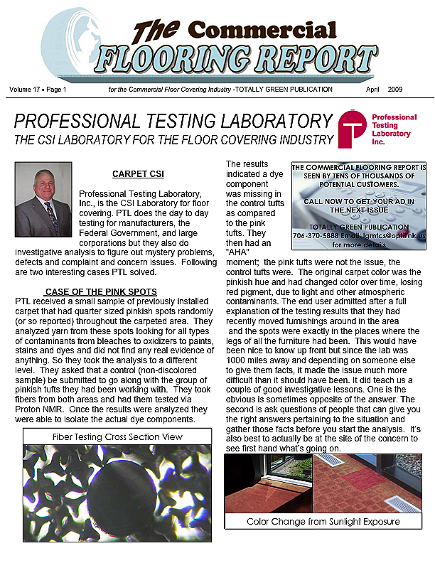 Professional Testing Laboratory, Inc., is the CSI Laboratory for floor covering. PTL does the day to day testing for manufacturers, the Federal Government, and large corporations but they also do investigative analysis to figure out mystery problems, defects and complaint and concern issues. Following are two interesting cases PTL solved.