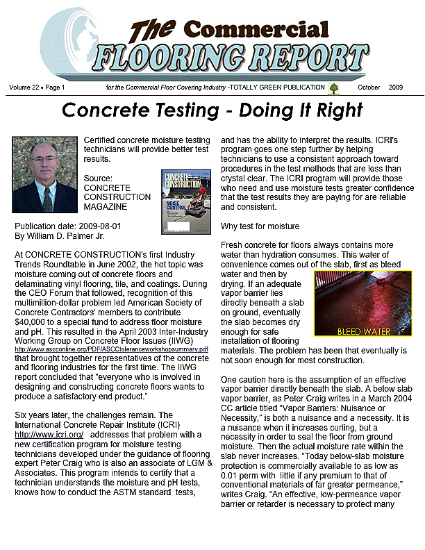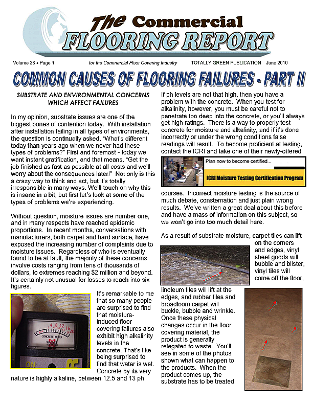 This month's issue has been provided in part by Jason Spangler of Wagner Meters http://www.wagnermeters.com/author/jspangler/ and deals with the continuing issue of moisture in concrete and testing for it. This issue is not going away and continues to plague the industry so you have to test but you have to understand the testing and that it must be done and done correctly. This article should help you deal with that.