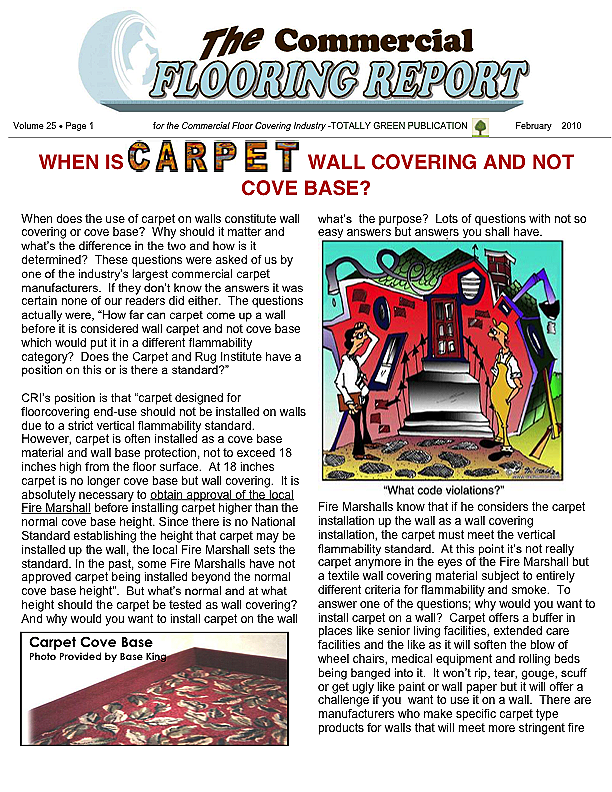 When does the use of carpet on walls constitute wall covering or cove base? Why should it matter and what's the difference in the two and how is it determined? These questions were asked of us by one of the industry's largest commercial carpet manufacturers. If they don't know the answers it was certain none of our readers did either. The questions actually were, "How far can carpet come up a wall before it is considered wall carpet and not cove base which would put it in a different flammability category? Does the Carpet and Rug Institute have a position on this or is there a standard?"