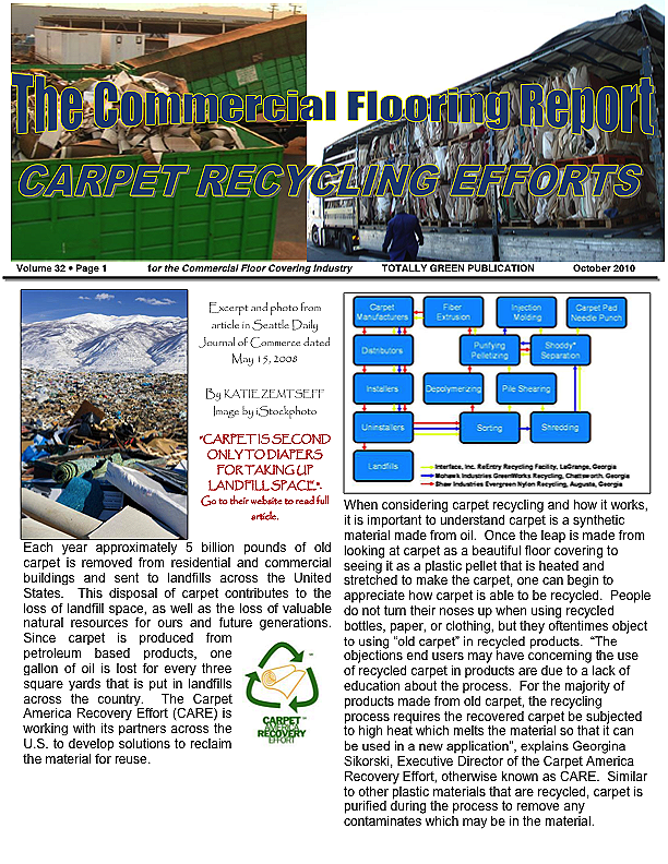 Each year approximately 5 billion pounds of old carpet is removed from residential and commercial buildings and sent to landfills across the United States. This disposal of carpet contributes to the loss of landfill space, as well as the loss of valuable natural resources for ours and future generations.