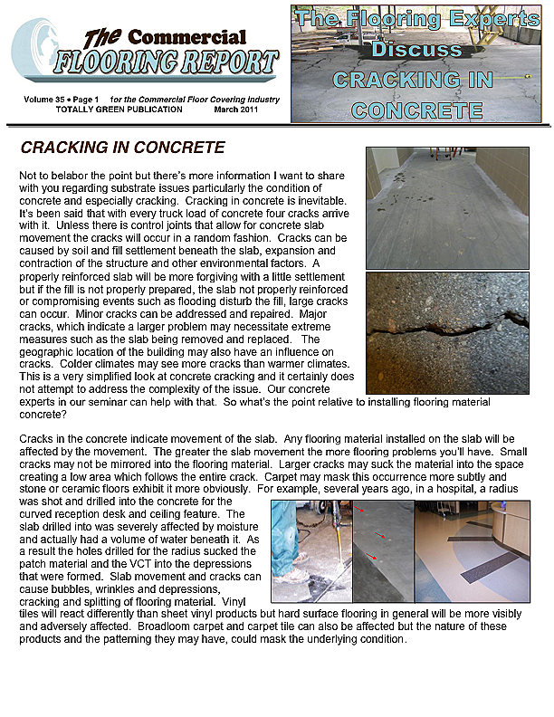 Not to belabor the point but there's more information I want to share with you regarding substrate issues particularly the condition of concrete and especially cracking. Cracking in concrete is inevitable. It's been said that with every truck load of concrete four cracks arrive with it. Unless there is control joints that allow for concrete slab movement the cracks will occur in a random fashion.