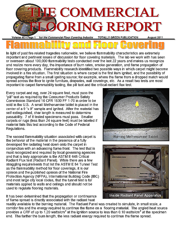In light of past fire related tragedies nationwide, we believe flammability characteristics are extremely important and pertinent issues of discussion for floor covering materials. The lab we work with has seen or overseen about 100,000 flammability tests conducted over the last 22 years and makes us recognize and realize more every day, the importance of burn rates, smoke generation, and flame propagation of floor covering products. Flammability research identified two possible ways in which carpet might become involved in a fire situation.