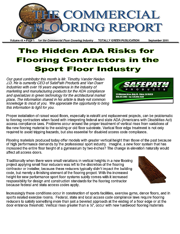 Our guest contributor this month is Mr. Timothy Vander Heiden J.D. He is currently CEO of SafePath Products and Van Duerr Industries with over 16 years experience in the industry of marketing and manufacturing products for the ADA compliance and specializes in green technology for the architectural market place. The information shared in his article is likely not common knowledge to most of you. We appreciate the opportunity to bring this information to light for you.