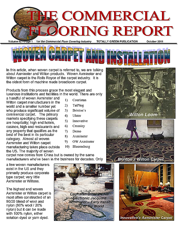 This article originally appeared in our September 2011 CFR is- sue but we've had an onslaught of work in this area and issues and I wanted to give you an update. Woven Axminster and Wil- ton carpet is the Rolls Royce of the carpet industry. It is the old- est form of machine made broadloom carpet. Products from this process grace the most elegant and luxurious homes and facilities in the world. There are only a handful of woven Axmin- ster and Wilton carpet manufacturers in the world and a smaller number yet who produce significant volume of commercial car- pet. The primary commercial markets for these carpets are hospitality (high end hotels), casinos, high end restaurants and any property that qualifies as the best of the best in its particular category. Almost all woven Axminster and Wilton carpet manu- facturing takes place outside the US with the majority of woven carpet now coming from state of the art mills in China but owned by the same manufacturers who've been in the business for dec- ades. Only a few woven manufacturers exist in the US and they primarily produce corporate type carpet. The highest end woven Axminster or Wilton carpet is most often constructed of an 80/20 blend of wool and nylon (80% wool / 20% nylon) - the nylon is used to bolster the performance of the wool - but it can also be made with 100% nylon - either solution dyed or yarn dyed.