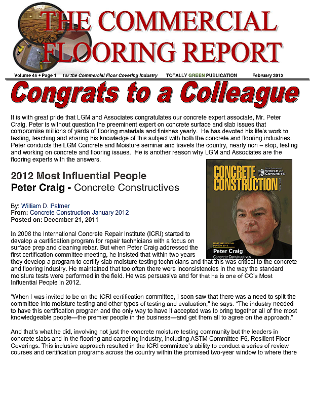 It is with great pride that LGM and Associates congratulates our concrete expert associate, Mr. Peter Craig. Peter is without question the preeminent expert on concrete surface and slab issues that compromise millions of yards of flooring materials and finishes yearly. He has devoted his life's work to testing, teaching and sharing his knowledge of this subject with both the concrete and flooring industries. Peter conducts the LGM Concrete and Moisture seminar and travels the country, nearly non-stop, testing and working on concrete and flooring issues. He is another reason why LGM and Associates are the flooring experts with the answers.
