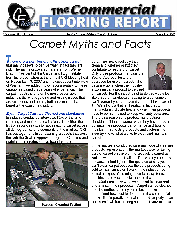[b]There are a number of myths about carpet[/b] that many believe to be true when in fact they are not. The myths uncovered here are from Werner Braun, President of the Carpet and Rug Institute, from his presentation at the annual CRI Meeting held on November 13, 2007 and my subsequent interview of Werner.