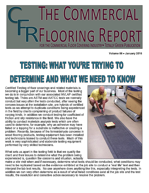 Certified Testing of floor coverings and related materials is becoming a bigger part of our business. Most of the testing we do is in conjunction with our associated NVLAP certified testing lab. There are ASTM and AATCC tests we normally conduct but very often the tests conducted, after seeing the concern issues at the installation site, are hybrids of certified tests as we attempt to duplicate conditions being experienced in the field by clients complaining of product failures of varying kinds. In addition we conduct testing for coefficient of friction and slip resistance in the field. We also have the ability to conduct materials analysis tests which are often used to determine, for example, why an adhesive may have failed or a topping for a substrate is ineffective or creating a problem. Recently, because of the formaldehyde concerns in wood flooring products, testing equipment has been installed and technicians trained to conduct these tests. Much of this work is very sophisticated and elaborate testing equipment performed by very skilled technicians.