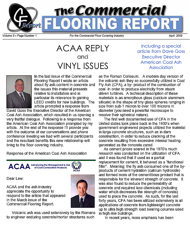 In the last issue of the Commercial Flooring Report I wrote an article about fly ash content in concrete and the issues this material presents relative to installation and in particular its relevance to gaining LEED credits for new buildings. The article prompted a response from David Goss the Executive Director of the American Coal Ash Association, which resulted in us pening a very fruitful dialogue. Following is a response from the American Coal Ash Association prompted by my article. At the end of the response I'll provide you with the outcome of our conversations and phone conference meeting we had with several participants and the resultant benefits this new relationship will bring to the floor covering industry.