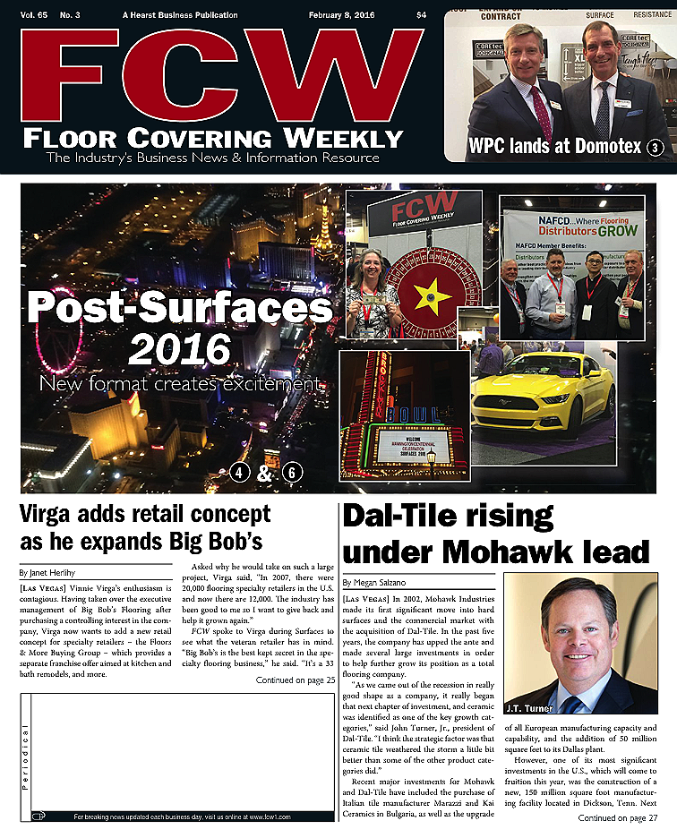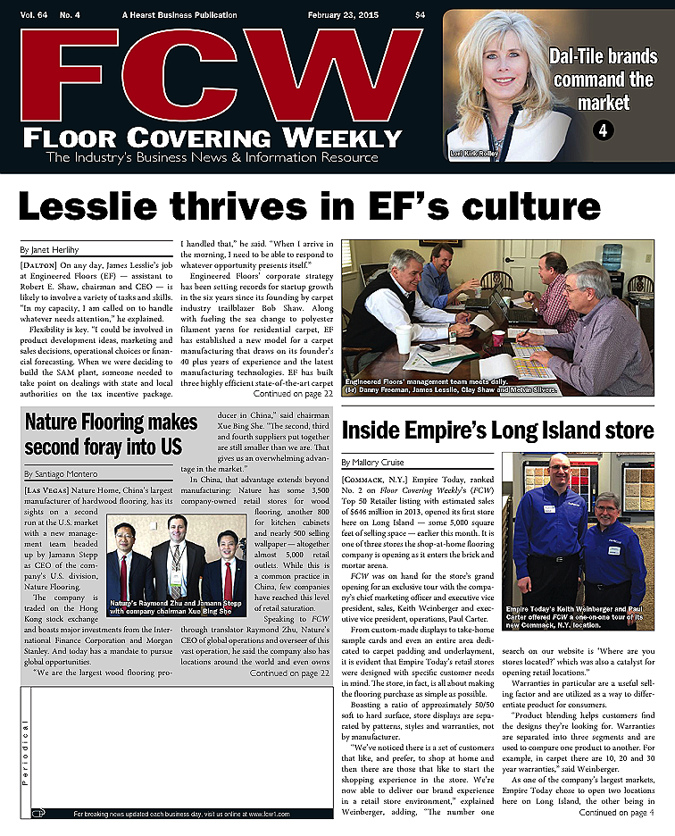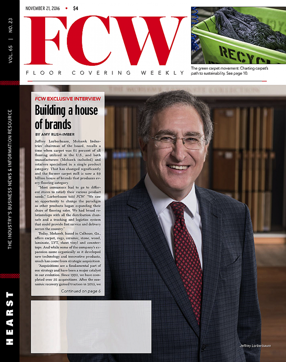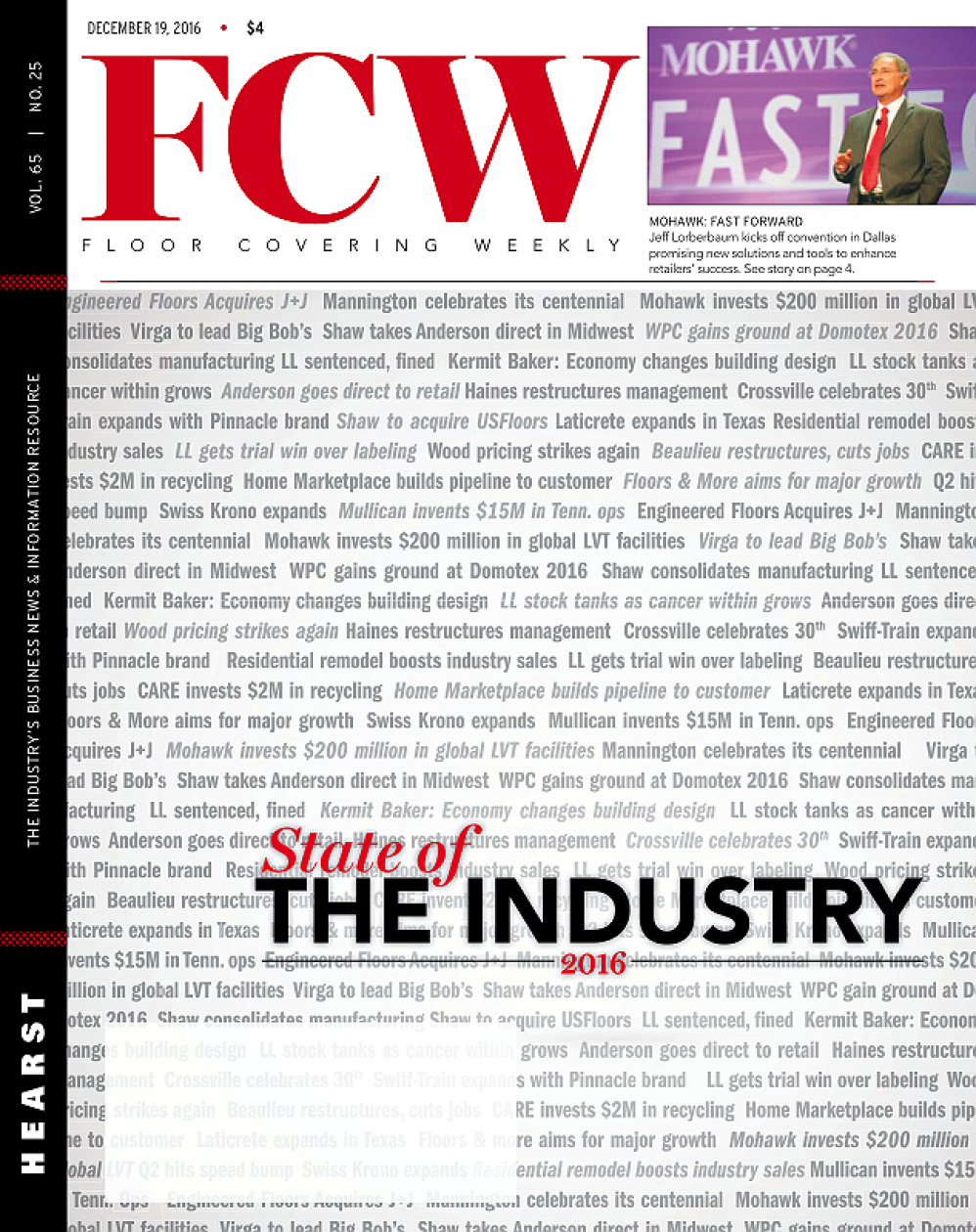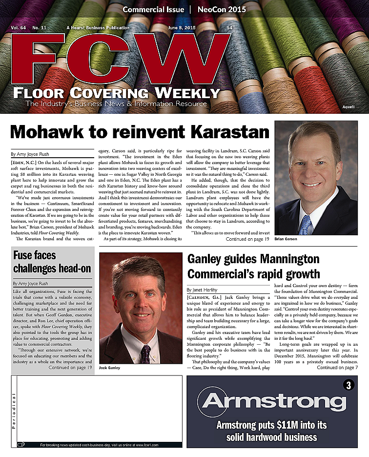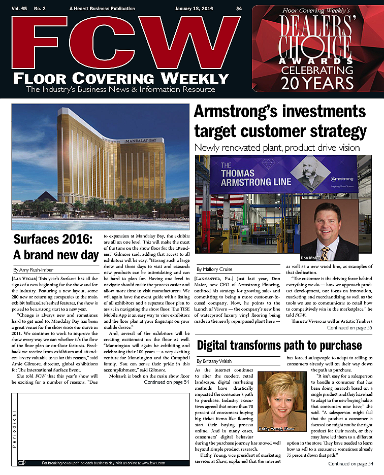 Floor Covering Weekly's mission is to touch the lives of our readers in positive ways by bringing them the full range of news and information they need in order to enhance their success in the floor covering industry. For more than 60 years, FCW has had a positive influence on the industry by providing unbiased and accurate coverage of industry events, changes, etc. as they develop. For retailers, we convey basic business information, strategies and updates as well as industry-specific news coverage of new product developments, merchandising and sales strategies. For manufacturers, we serve as a way for them to communicate directly with their retail customers.