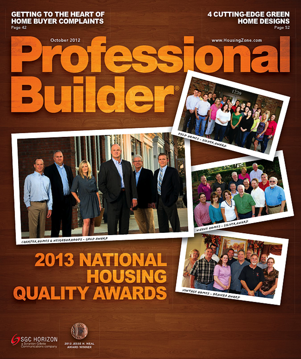 The 2013 NHQ Awards class includes Gold winner Charter Homes & Neighborhoods, just the fourth builder to win NHQ's highest honor since 2006 and one of only a few firms to have won all three NHQ distinctions: Gold, Silver, and Bronze.
